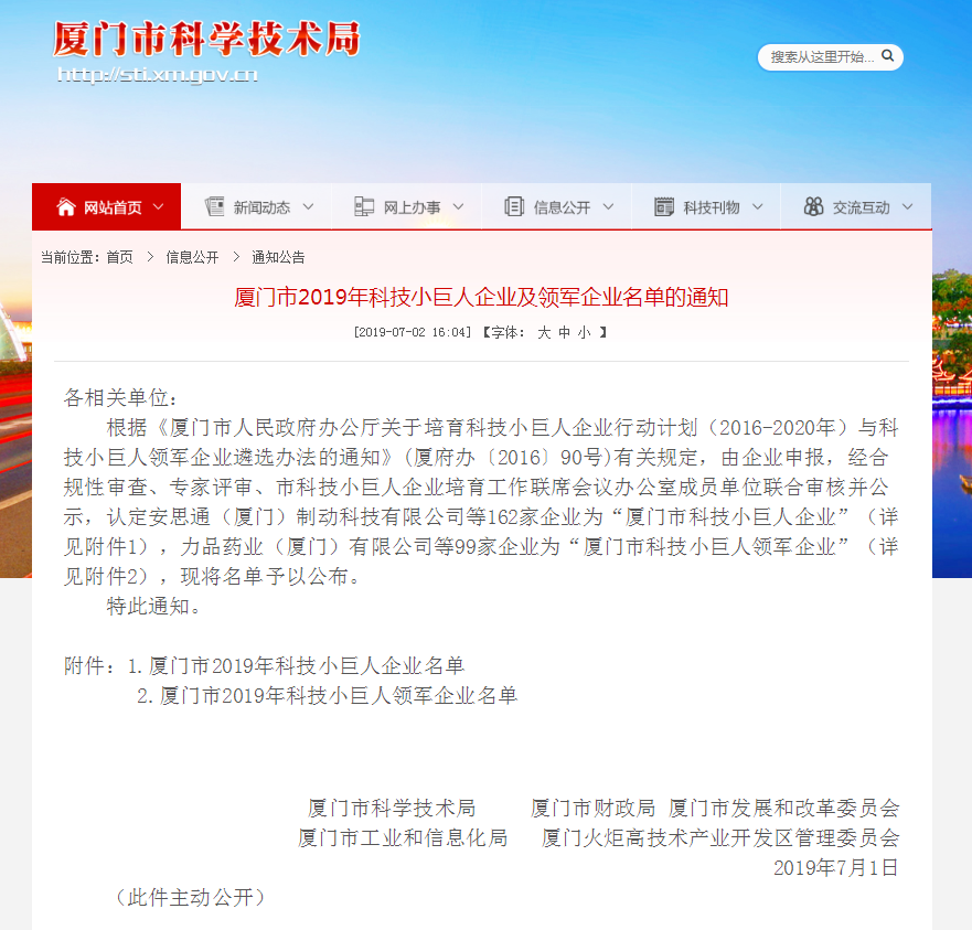 近日,廈門市科學技術局公布了廈門市2019年科技小巨人企業及領軍企業名單,廈門安科科技有限公司(下簡稱:廈門安科)作為極具潛力的新興企業代表榮獲“廈門市科技小巨人領軍企業”稱號??萍夹【奕祟I軍企業是省科技廳、省發改委、省工信廳、省財政廳根據《福建省人民政府辦公廳關于印發培育科技小巨人領軍企業行動計劃(20···