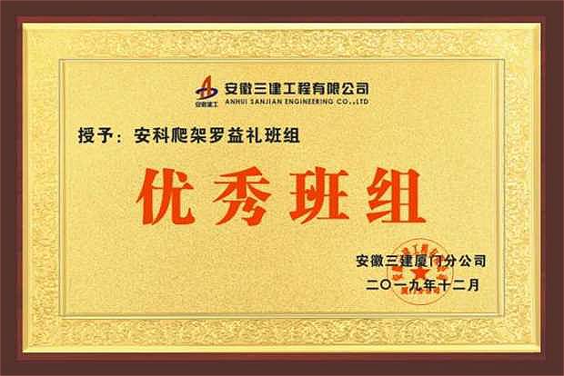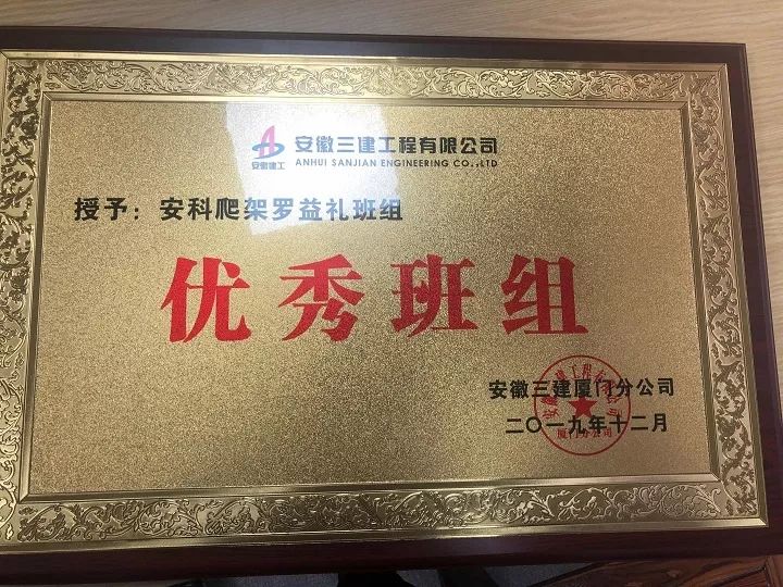 ?廈門安科榮獲安徽三建廈門分公司頒發(fā)的2019年“優(yōu)秀班組”榮譽(yù)證書