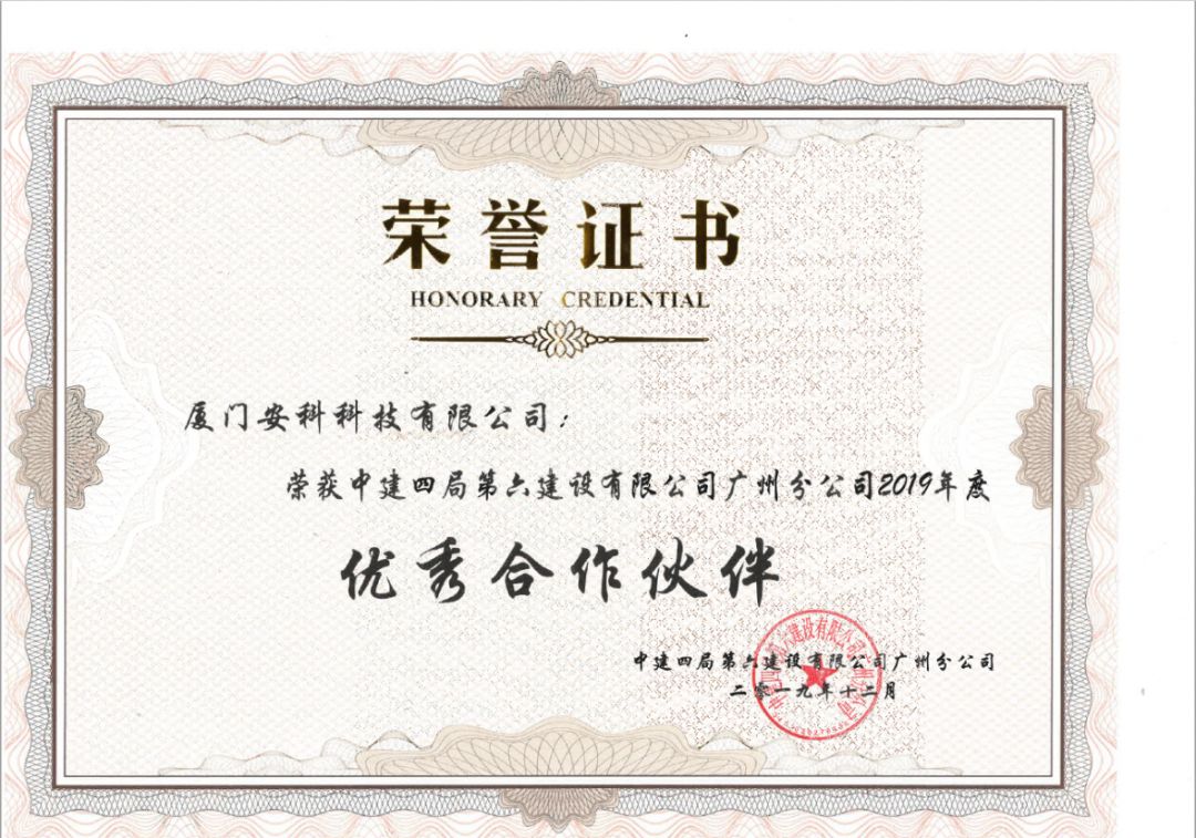 ?廈門安科榮獲中建四局第六建設(shè)有限公司廣州分公司頒發(fā)的2019年年度“優(yōu)秀合作伙伴”榮譽(yù)證書