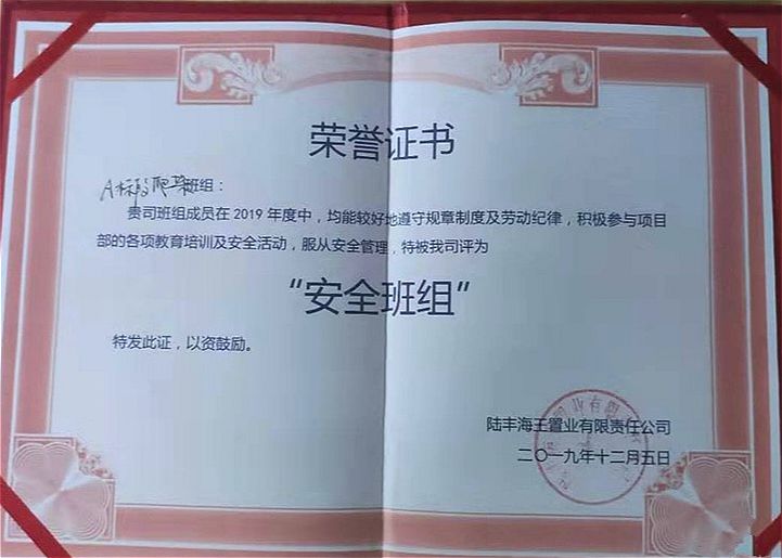 ?廈門安科榮獲陸豐海王置業(yè)有限責(zé)任公司頒發(fā)的2019年“安全班組”榮譽(yù)證書