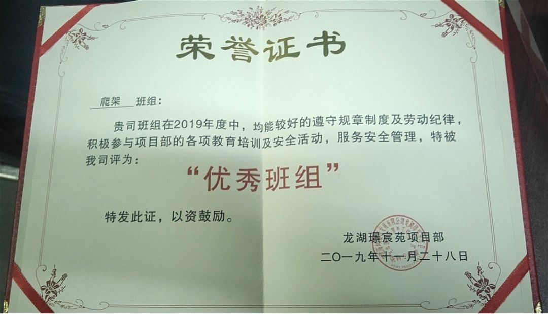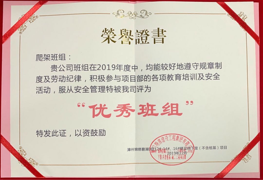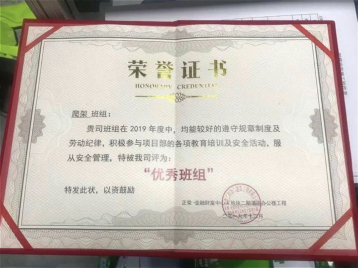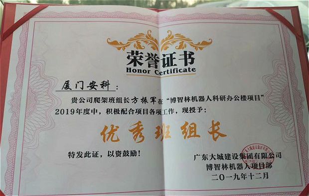 ?廈門安科爬架班組長方振軍獲廣東大城建設(shè)集團(tuán)有限公司頒發(fā)的2019年“優(yōu)秀班組長”榮譽(yù)證書