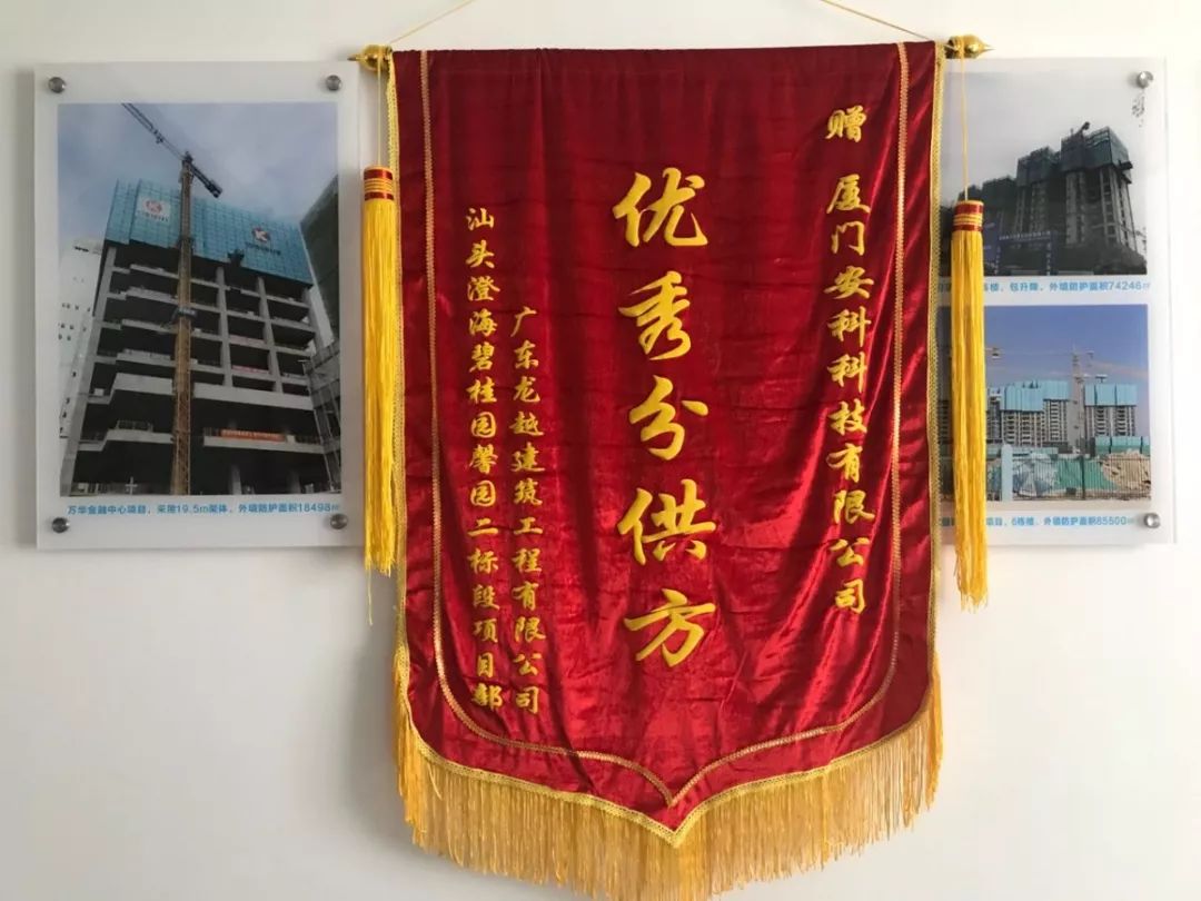 廈門安科獲廣東龍?jiān)浇ㄖこ逃邢薰?/strong>頒發(fā)的“優(yōu)秀分供方”榮譽(yù)錦旗