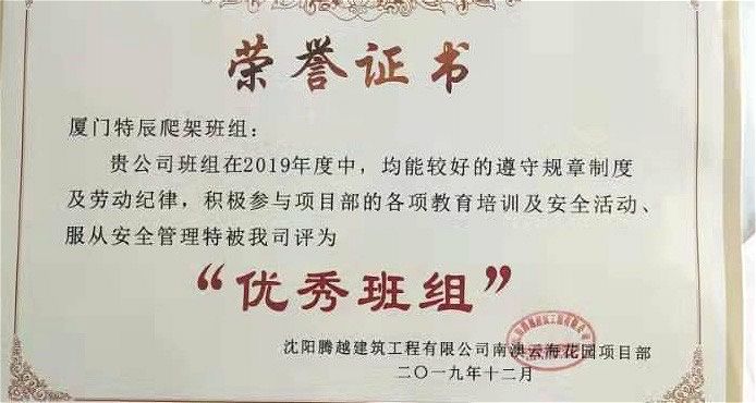 ?廈門安科旗下全資子公司—廈門特辰科技有限公司榮獲沈陽騰越建筑工程有限公司頒發(fā)的2019年“優(yōu)秀班組”榮譽(yù)證書