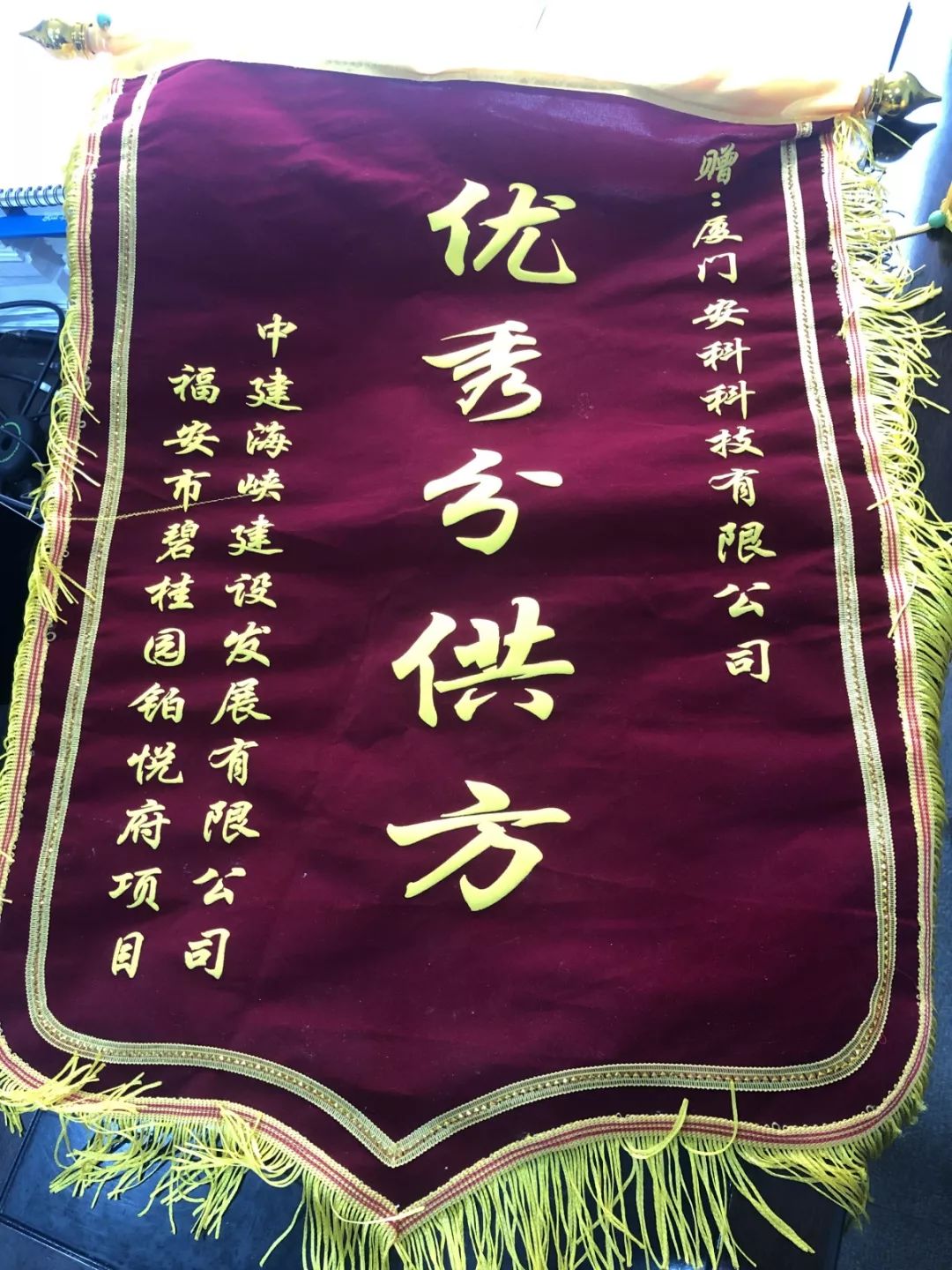 廈門安科獲中建海峽建設(shè)發(fā)展有限公司頒發(fā)的“優(yōu)秀分供方”榮譽(yù)錦旗