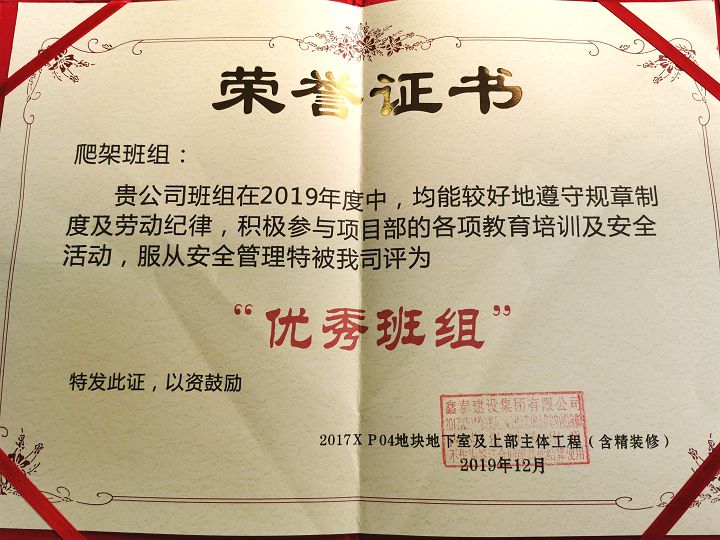 ?廈門安科榮獲福建鑫泰建筑集團(tuán)有限公司頒發(fā)的2019年“優(yōu)秀班組”榮譽(yù)證書