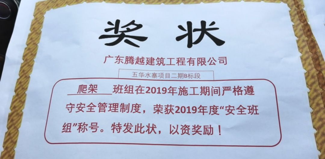 ?廈門安科榮獲廣東騰越建筑工程有限公司頒發(fā)的2019年“安全班組”榮譽(yù)證書