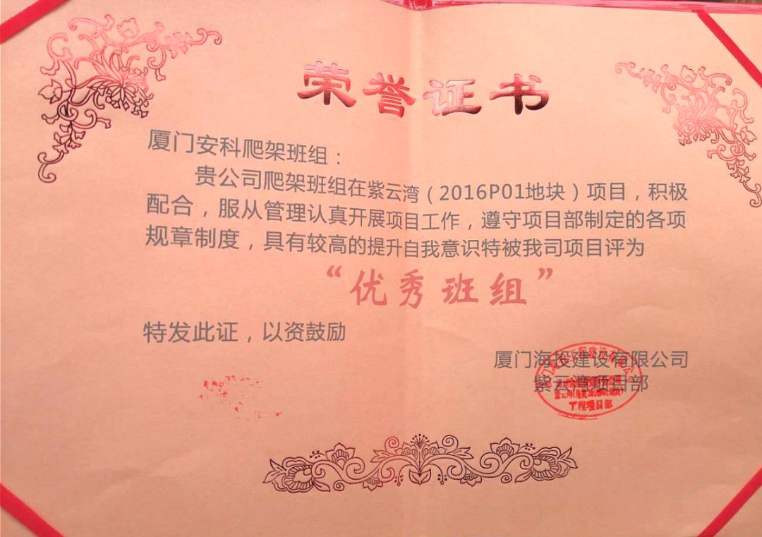 ?廈門安科榮獲廈門海投建設(shè)有限公司頒發(fā)的“優(yōu)秀班組”榮譽(yù)證書