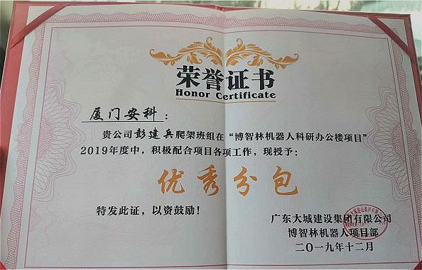 ?廈門安科榮獲廣東大城建設(shè)集團(tuán)有限公司頒發(fā)的2019年“優(yōu)秀分包”榮譽(yù)證書