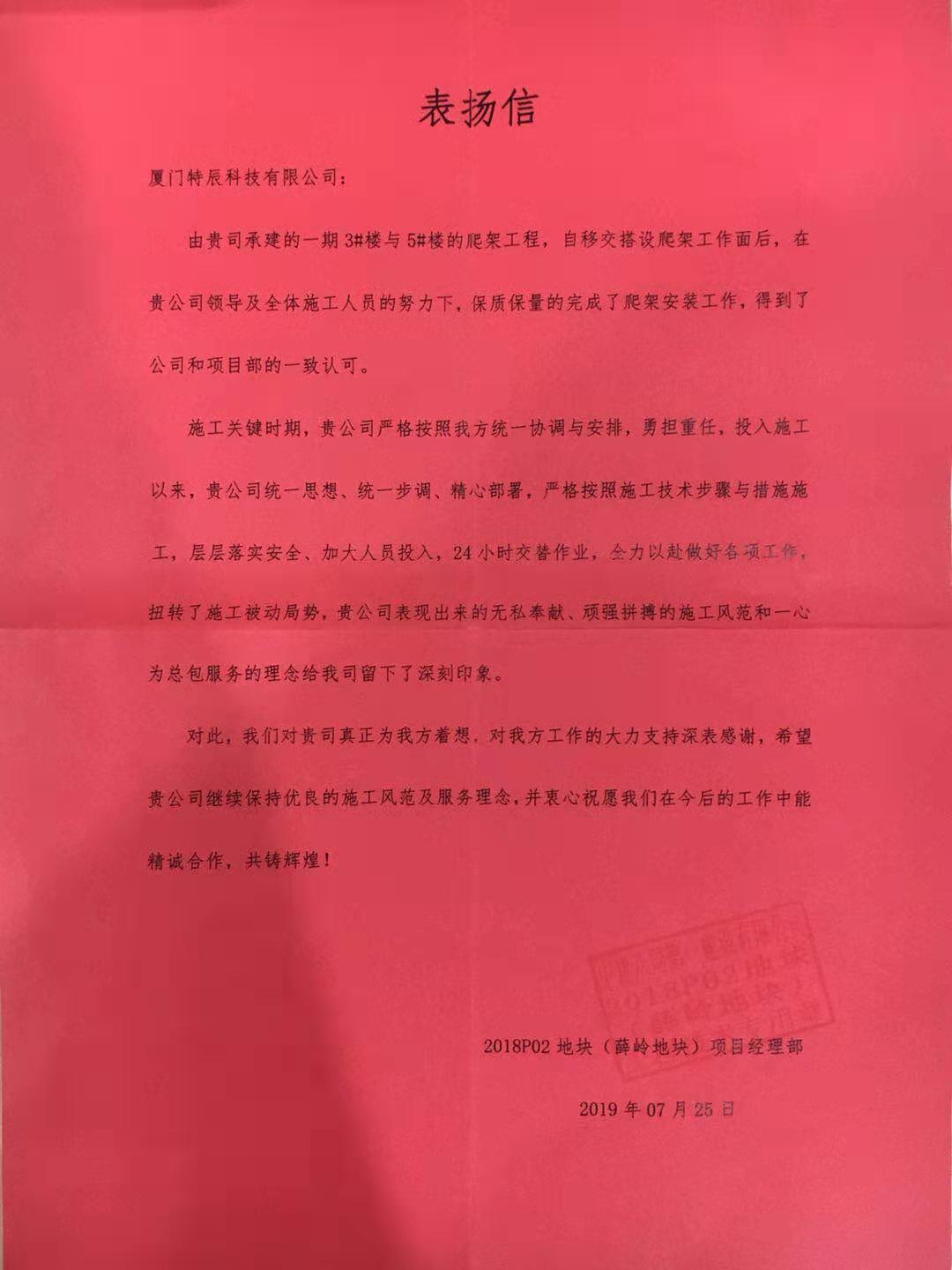 廈門安科旗下子公司——廈門特辰科技有限公司收到一封來自中建八局第一建設(shè)有限公司的表揚(yáng)信。對廈門特辰無私奉獻(xiàn)、頑強(qiáng)拼搏的施工風(fēng)范和一心為總包服務(wù)的理念表示高度贊揚(yáng),表揚(yáng)信的具體內(nèi)容如下:
