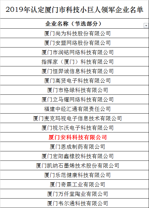 近日,廈門市科學(xué)技術(shù)局公布了廈門市2019年科技小巨人企業(yè)及領(lǐng)軍企業(yè)名單,廈門安科科技有限公司(下簡(jiǎn)稱:廈門安科)作為極具潛力的新興企業(yè)代表榮獲“廈門市科技小巨人領(lǐng)軍企業(yè)”稱號(hào)。