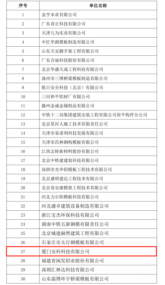 今日,中國模板腳手架協會公布了第二批入選中國鐵建集采平臺會員企業名單,廈門安科科技有限公司(以下簡稱:廈門安科)憑借雄厚的科研創新能力、優質的發展潛力和良好的品牌實力等方面被協會推薦入選進入中國鐵建集采平臺系統——鐵建商城(CRCC商城)。